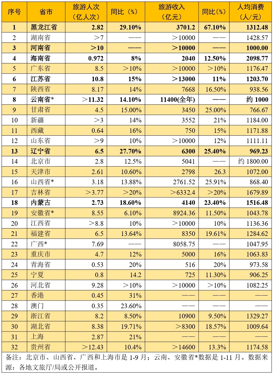 从各省旅游收入来看。有江苏省、江西省、湖南省、河南省等10个省份,轻松突破万亿元小目标,而贵州以接近1.5亿元收入,暂居第一。从增长率来看,东北地区旅游收入同样强劲。特别是黑龙江省旅游收入同比增长67.10%,遥遥领先;辽宁以25.40%紧跟其后。整体而言,网红城市资源的目的地,旅游人次和收入增长受益明显。