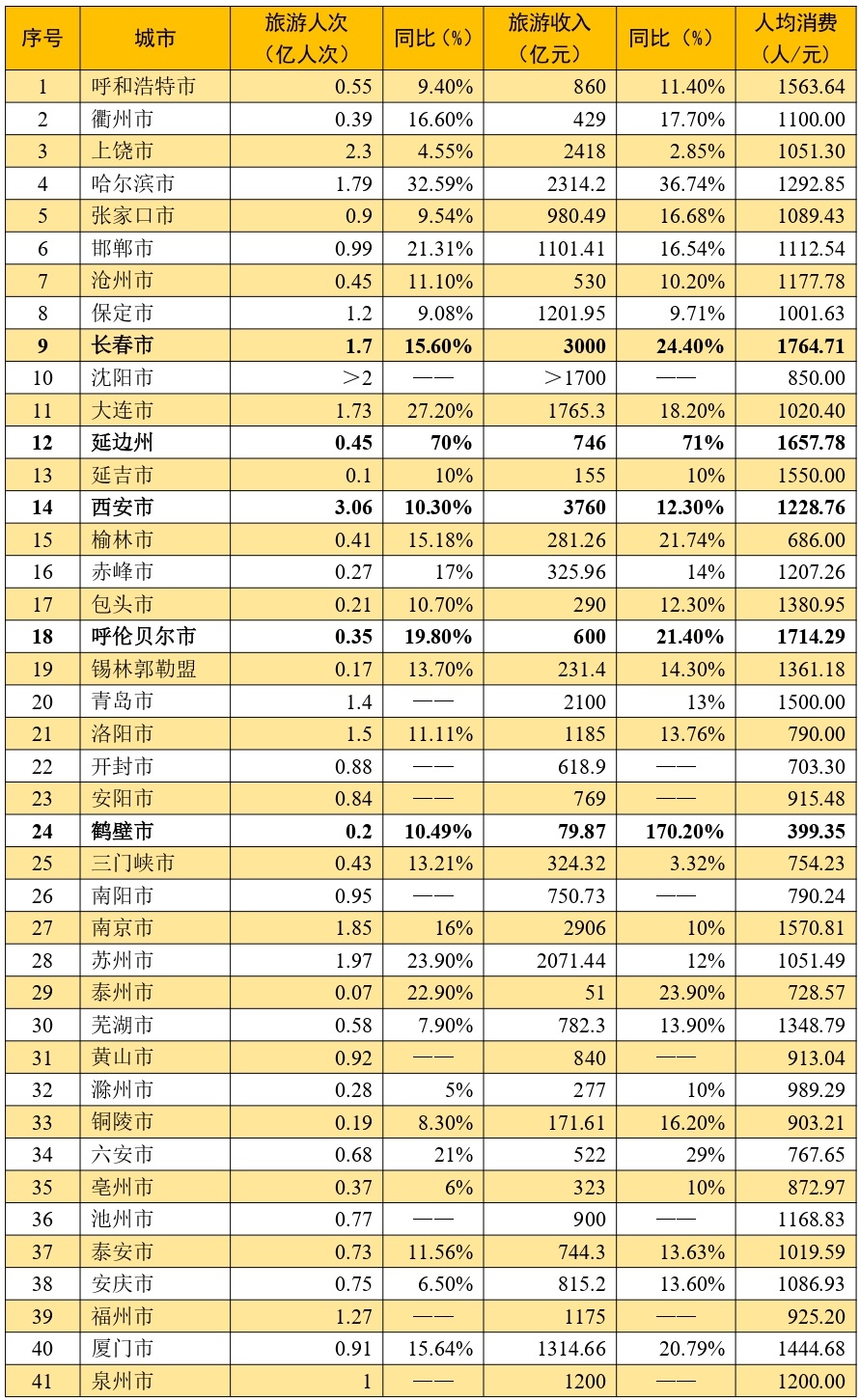 4.双冠王:旅游收入和接待人次昆明占优从主要城市旅游收入来看。昆明市以4862亿元的旅游收入,暂居第一。除此之外,旅游收入超过三千亿元的城市有西安市、重庆市、成都市和长春市,分别为3760亿元、3552.6亿元、3120.3亿元和3000亿元;有包括南京市、深圳市、上饶市、哈尔滨市、贵阳市等在内的9个城市的旅游收入超过2000亿元。从增长率来看,鹤壁市同比增长率暂时最高,达到170.20%,紧随其后的是湘潭市和延边州,分别为96.99%和71%。从统计情况来看,有接近七成的城市旅游收入增长率达到两位数以上。2024年,国内出游消费依然火爆。