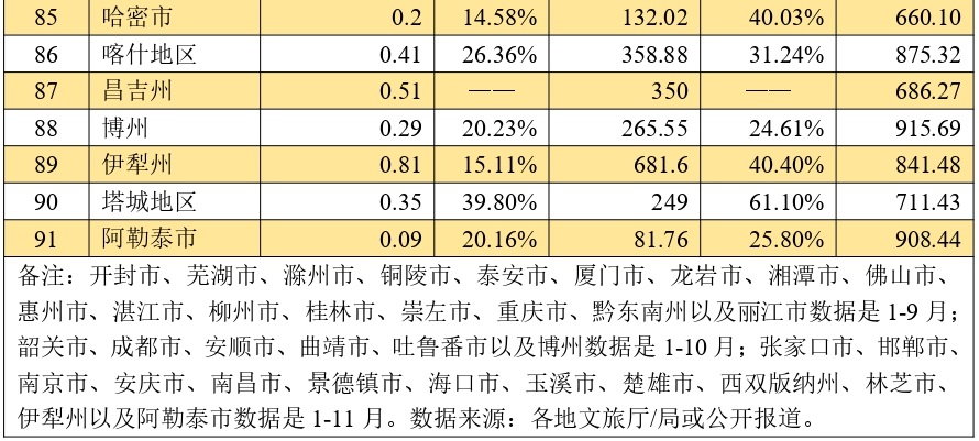 从主要城市旅游接待人次来看。昆明市以3.42亿人次的旅游接待人次,暂居第一。另外,重庆市、西安市分别接待3.3亿人次和3.06亿人次,暂居第二和第三。成都市、上饶市、南昌市、长沙市等21个城市的旅游接待人次超过1亿人次。从增长率来看,延边州同比增长率暂时最高,达到70%,紧随其后的是湘潭市和塔城地区,分别为55.65%和39.80%。2024年,国内出游人气旺盛。