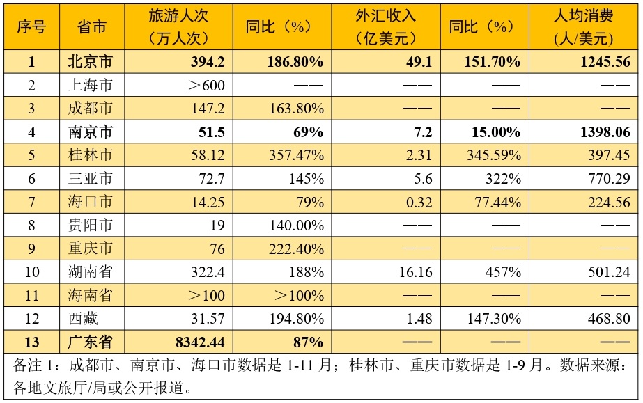 从接待入境游客数量来看。广东省以预计接待8342.44万人次,同比增长87%,稳居第一,其中港澳入境贡献巨大。其次是,上海市预计将接待超过600万人次,北京市接待394.2万人次。